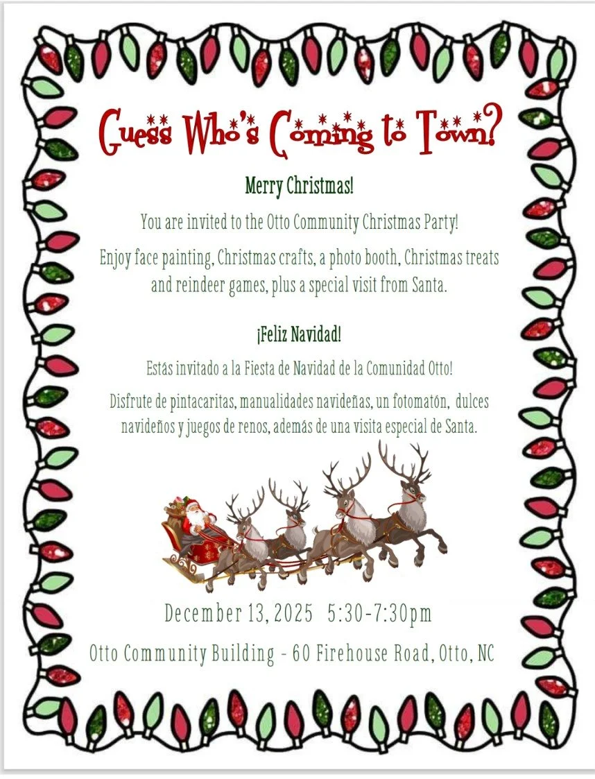 Whether you're coming on your own or bringing your children and grandchildren, we invite you to join us at the Otto Community Center for our annual Christmas Party on December 13th, from 5:30 PM to 7:30 PM! Everyone is welcome to share in the festive spirit, enjoy holiday activities, and create joyful memories together. We look forward to celebrating with you—whether individually or with family—and brightening the season as a community! For additional information, please see the flyer below.